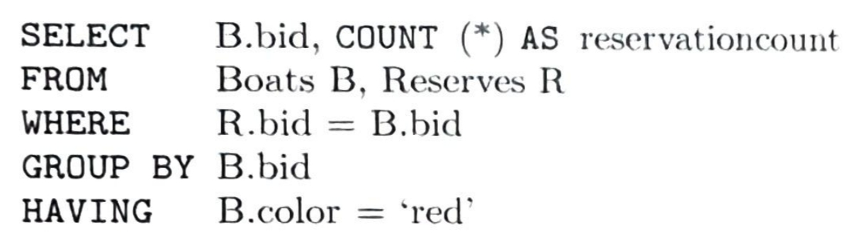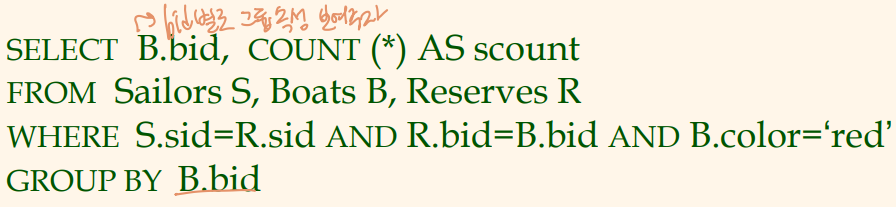 그룹 애트리뷰트 bid가 Boats의 키(따라서 color를 결정)이므로 SQL은 이 질의를 허용하지 않음.