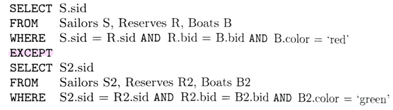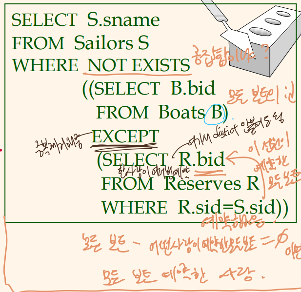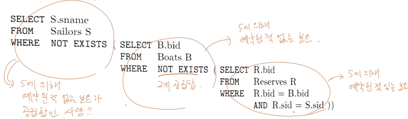 NOT EXIST를 사용하면, 적색 배를 예약하지 않은 뱃사람의 이름 등을 계산 가능.