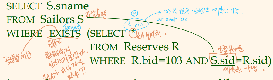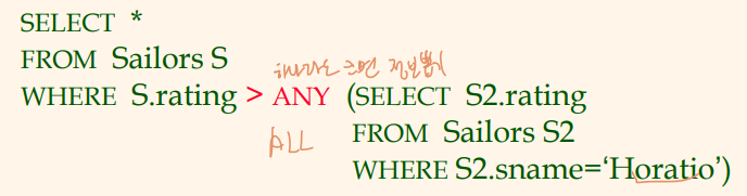 - EXISTS : 집합이 공집합이 아닌지를 점검함. (<-> NOT EXISTS)