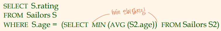 - HAVING절의 group-qualification에서 나타나는 수식들은 그룹 당 하나의 값만을 가져야 함