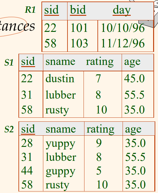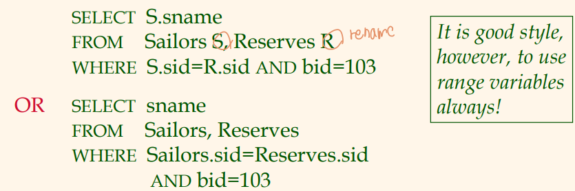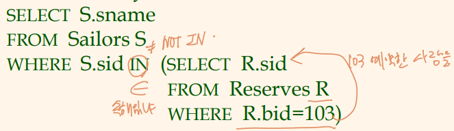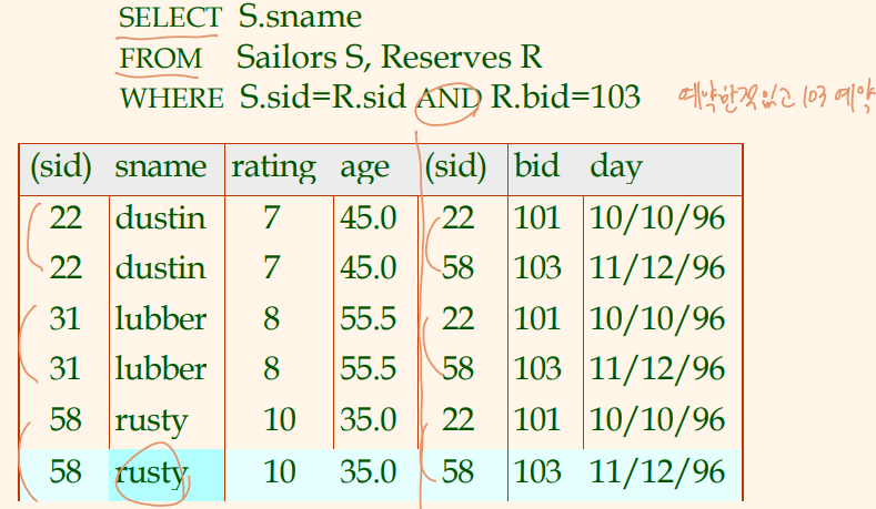 공집합이 아니라면, 뱃사람 S는 배 103을 예약했고, 그 이름을 검색하게 됨.