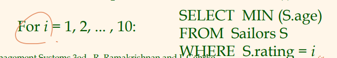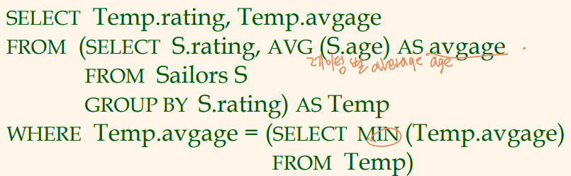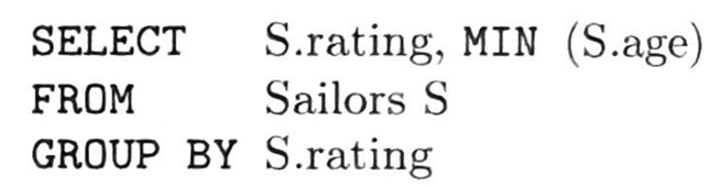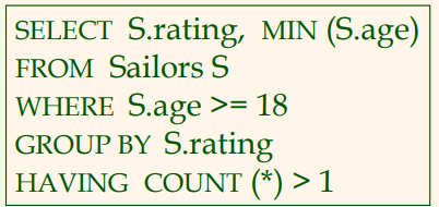 (WHERE절이 먼저 적용되지 않았다면 rating=10의 그룹도 group-qualification 만족함. 순서 중요!) - 남아있는 각 그룹마다 하나의 답 행을 만듦