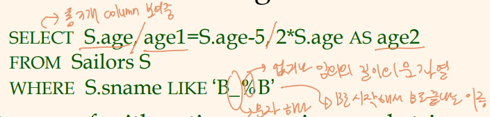 - WHERE : FROM절에서 언급된 테이블들에 대한 선택 조건을 표시 (선택, 행, 셀렉션 σ)
