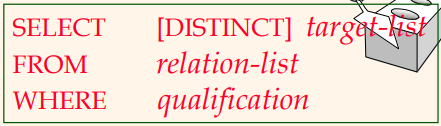 - SELECT : 결과에 유지되는 열들을 표시 (추출, 열, 프로젝션 π)