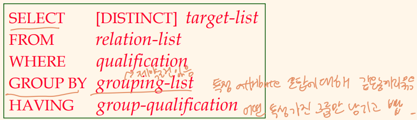 - target-list에 나타나는 모든 열은 grouping-list에도 나타나야 함. (aggregation함수에 사용하는 건 노상관)