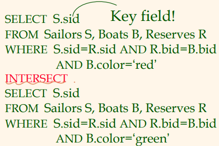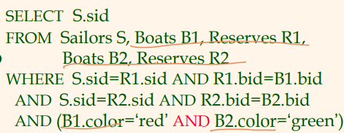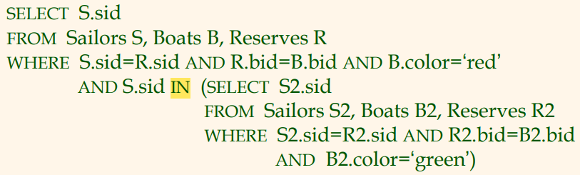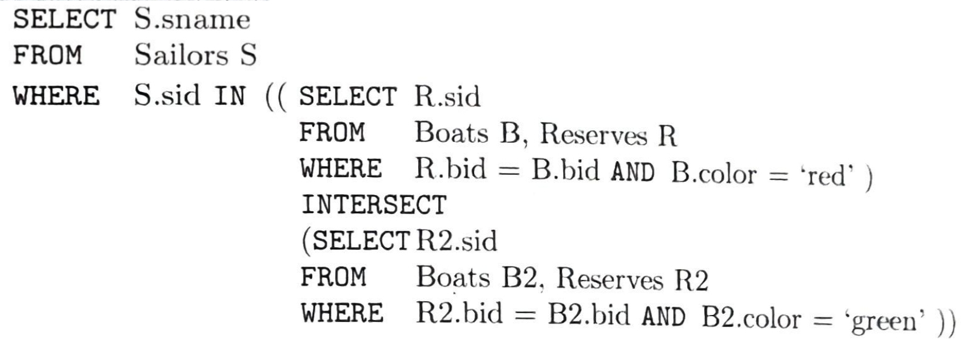 녹색 배를 예약한 뱃사람들의 sid 집합에 포함된 sid를 갖는 모든 뱃사람들을 구하기.