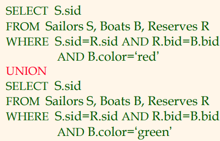 Q5) 적색 혹은 녹색 배를 예약한 적이 있는 뱃사람의 번호를 구하시오.