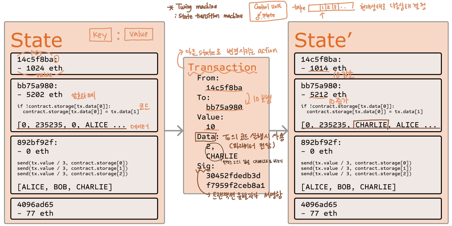 Turing Machine의 실행 결과로 변경되는 내용이 블록체인에 저장됨.