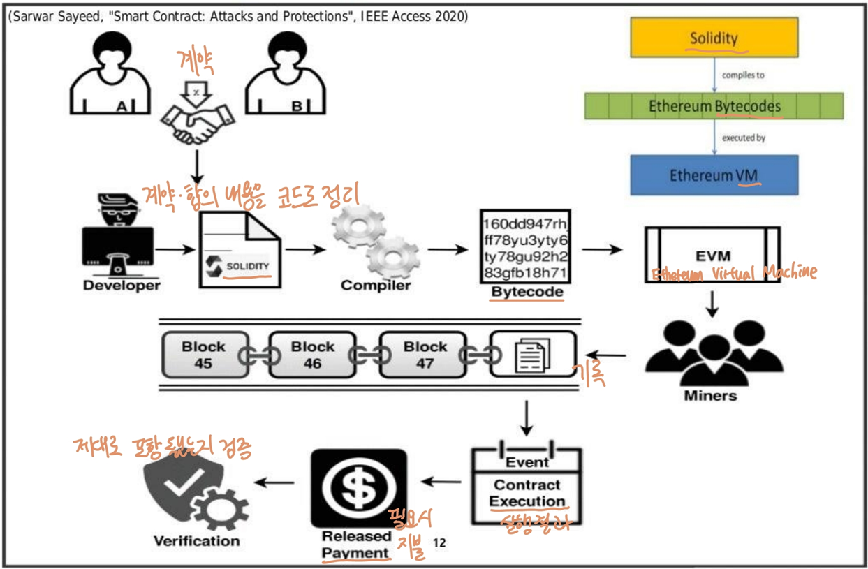: Solidity등의 이더리움에서 지원하는 프로그래밍 언어로 작성된 코드(smart contract)를