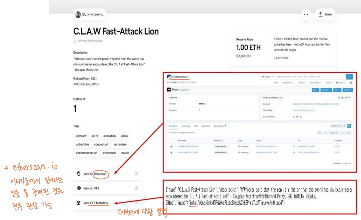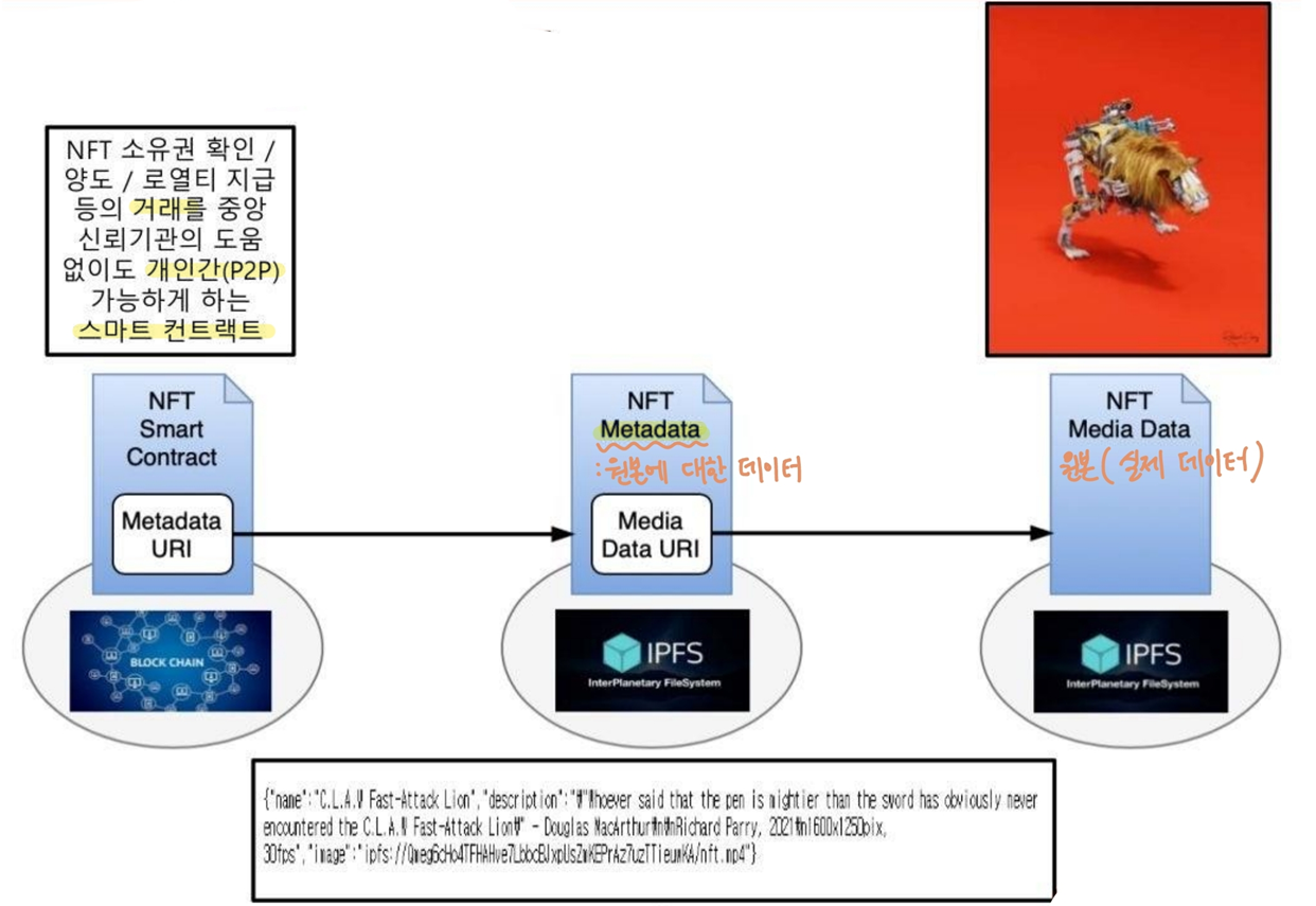 NFT는 작품에 대한 설명을 가지고있는 셈이고 그 설명이 블록체인에 저장되는 형태임.