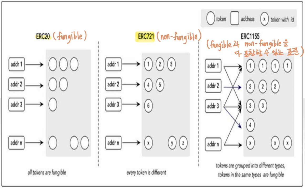 ex) ERC20(fungible), ERC721(non-fungible)