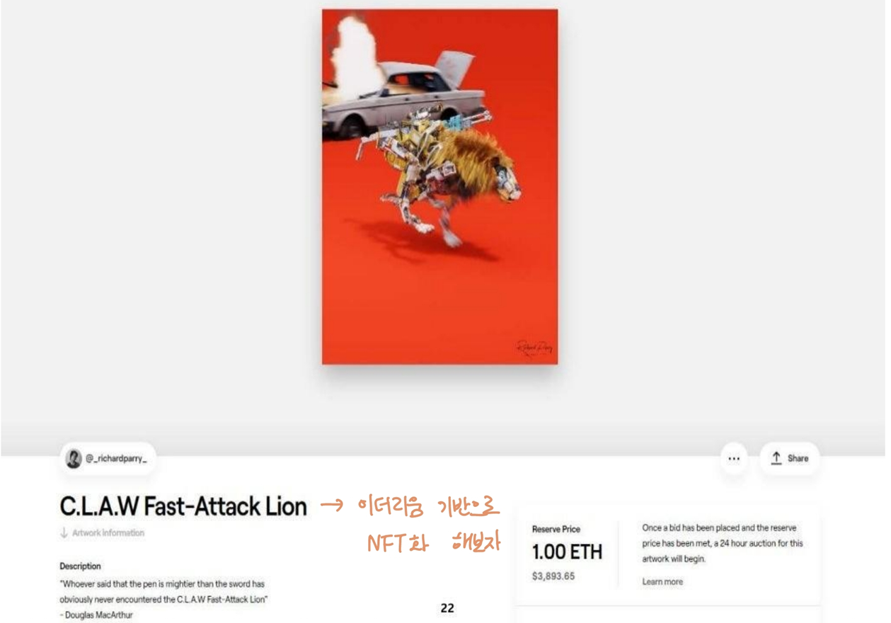 NFT 그 자체가 작품은 아님. ( NFT ≠ 원본 작품) NFT는 원본 작품이 아니라 인증서에 가까움.
