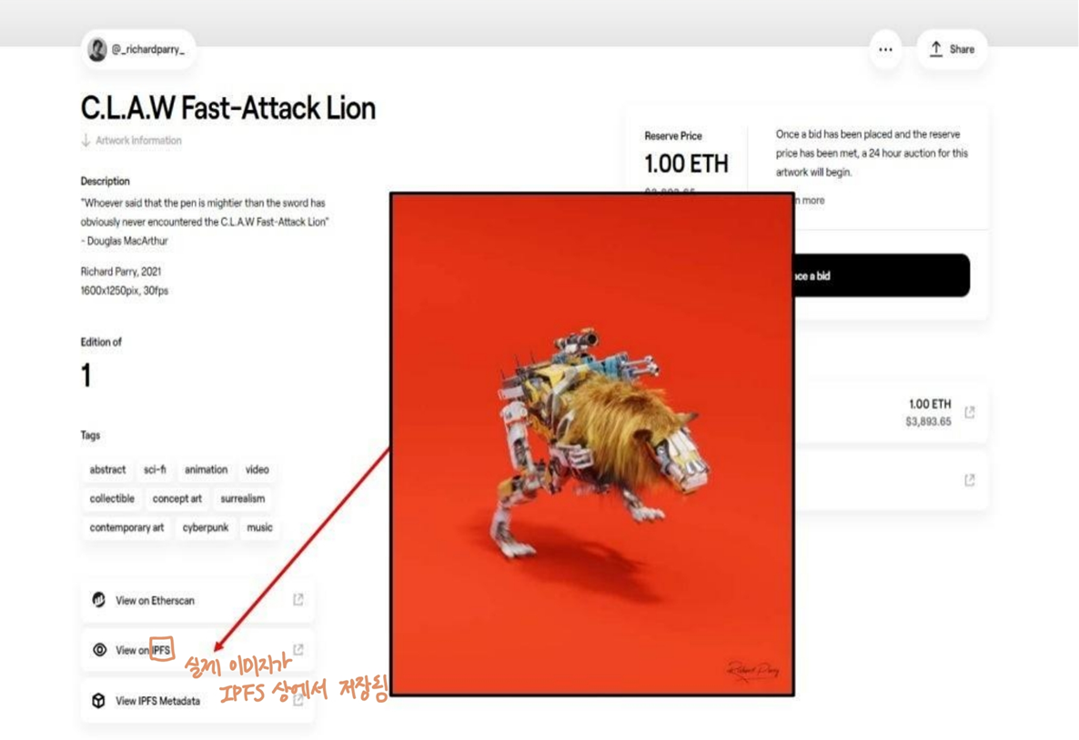 - 원본 작품을 블록체인에 저장해도 됨. 가용성 측면에서 굉장한 이점(절대 사라지지x)이지만 비용이 많이 듦.