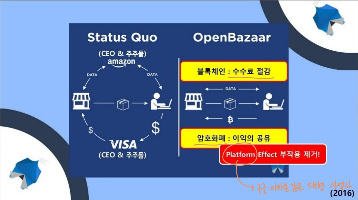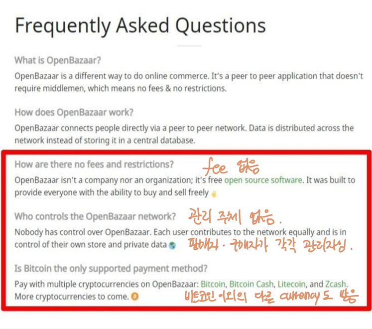 : G마켓 등은 물건을 판매하는 사이트가 존재하지만 OpenBazaar는 우리가 마켓이라고 주장하는 서버가 없음.