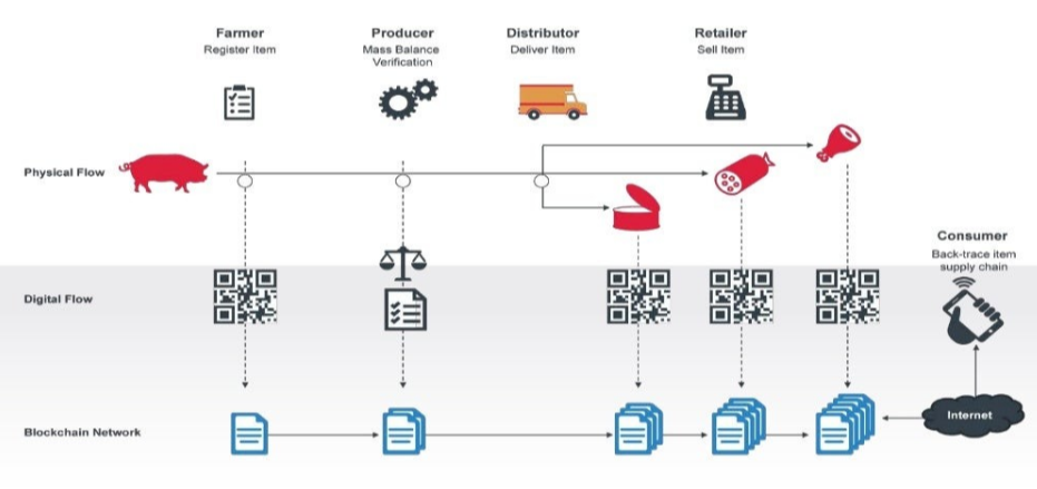 유통단계마다 블록체인에 유통 내용을 기록함으로써 최종 사용자에게 원산지와 도축 및 유통경로 정보 제공.