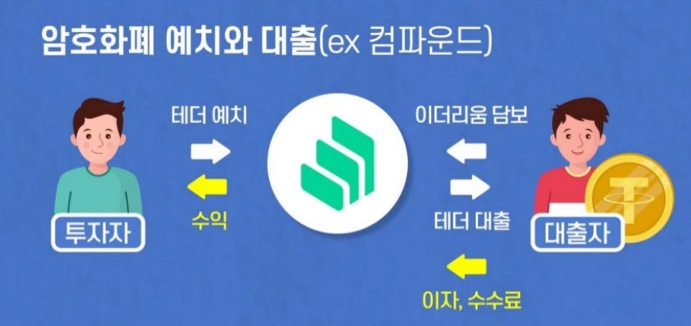 투자자는 테더를 예치한 대가로 수익을 받고, 대출자는 이더리움을 담보로 테더를 대출받는 대가로 이자와 수수료를 지불함. => 컴파운드가 화폐의 유동성을 높이는 데 도움 됨.