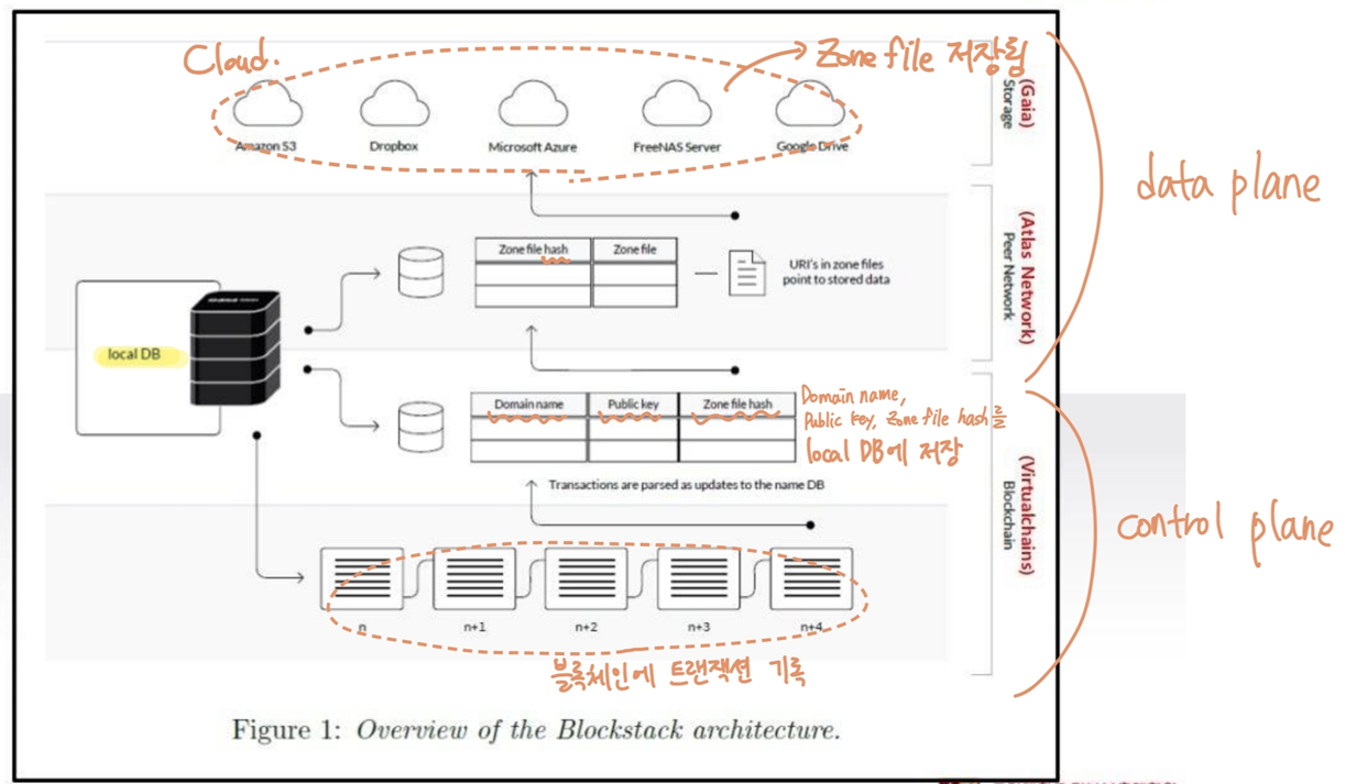궁극적으로 블록체인 내용이 cloud storage에 특정 영역(Zone file)과 암호학적 기법으로 연결됨.
