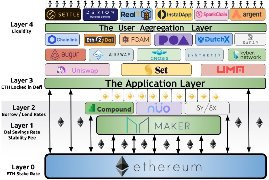 대출, 투자, 탈중앙화 거래소 등의 금융서비스를 smart contrat 지원 플랫폼에서 구현한 탈중앙화된 금융 서비스.
