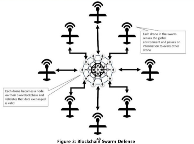 드론 사이의 통신 내용을 블록체인을 통해 공유하여 공격을 막고 비잔틴 문제 해결(몇몇 드론이 오동작하더라도 나머지 드론은 공격 액션 취함.)