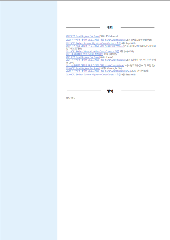 ICPC, 신촌지역대학교뭐시기 연합 등 다수 대회 참여라고 쓰고 SUAPC 혹은 캠콘의 경우는 맨 위에 거에다가 만 간략하게 대회에 대한 소개를 넣자