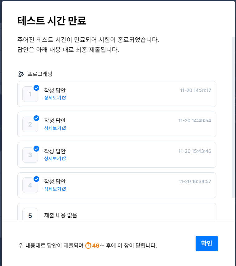 코딩 테스트는 24일 23:59 이전까지 원하는 날 3시간 동안 응시할 수 있었고 총 5문항이 출제되었다.