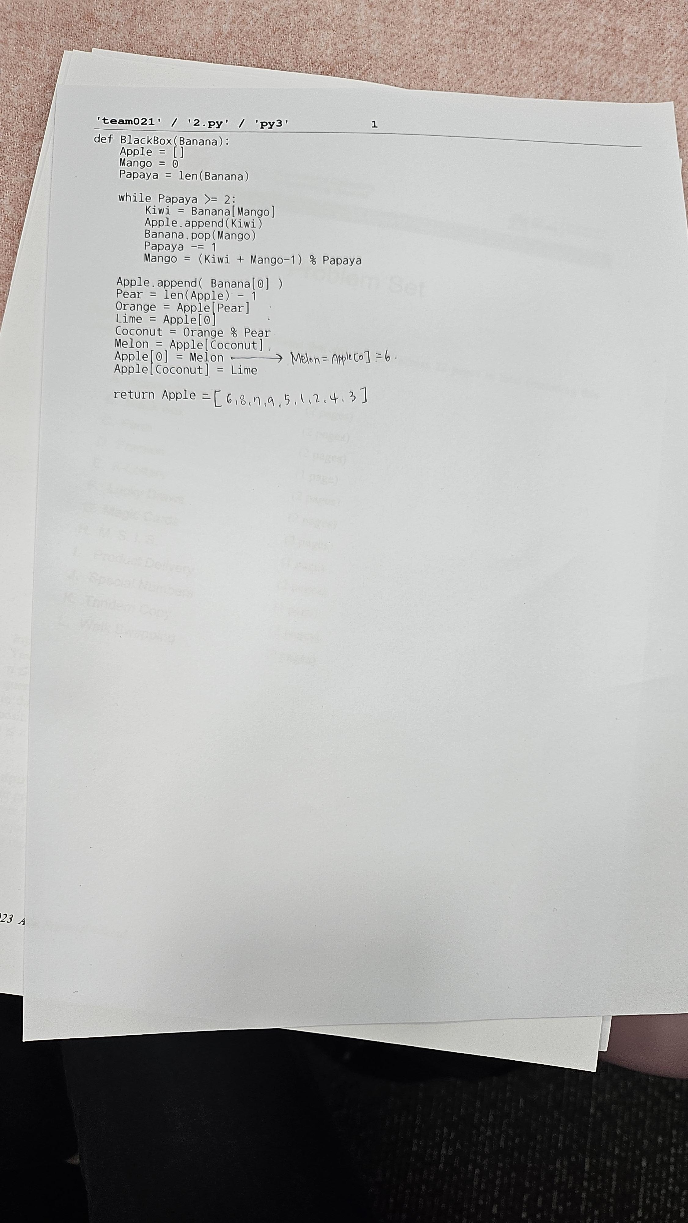 수열을 매개변수로 받는 파이썬 수도코드 함수가 주어지고, 함수의 리턴값이 주어질 때, 매개변수로 받은 수열을 구하는 문제였다.