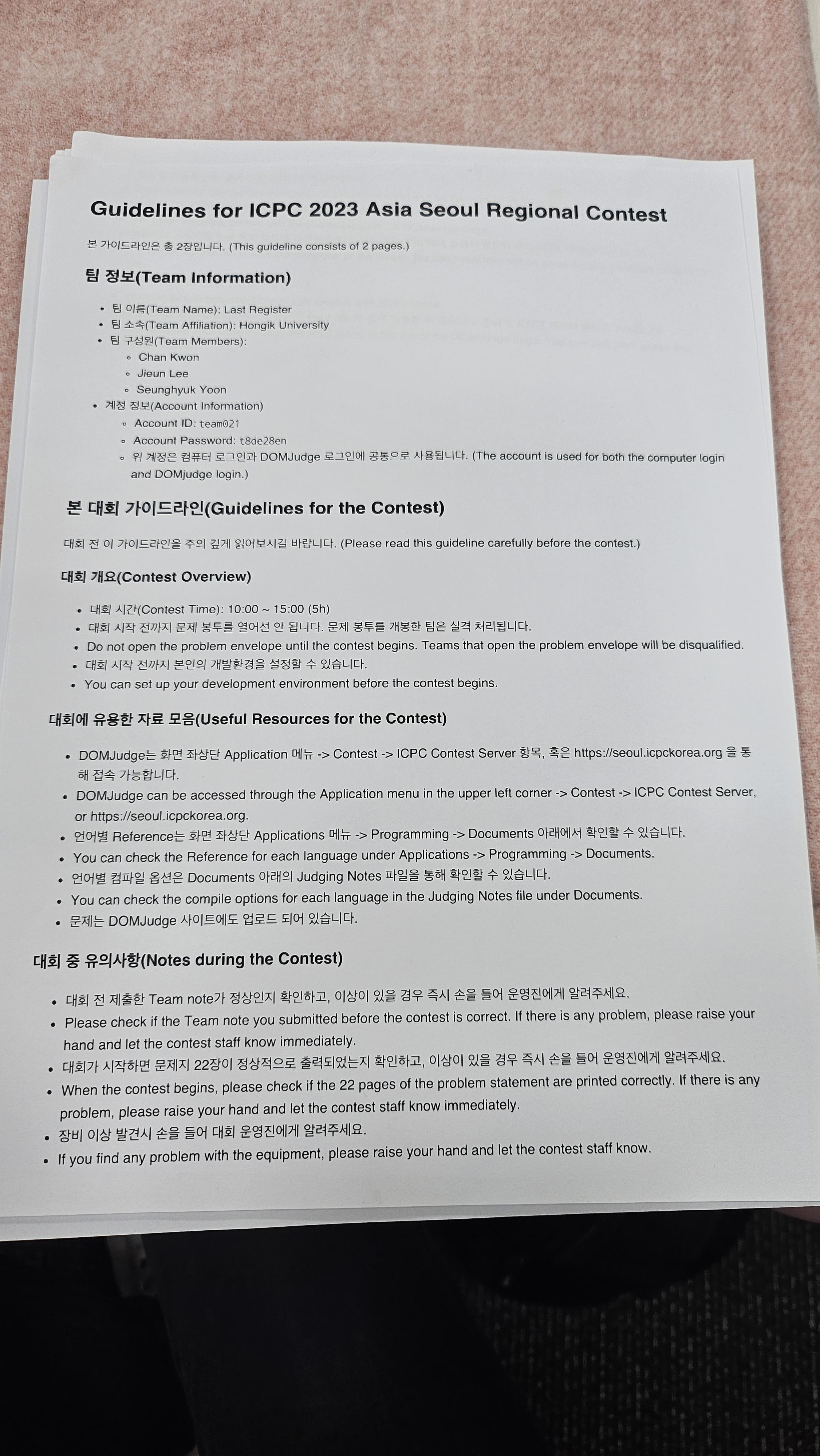 H가 쉬워 보여서 읽었는데 입력이 너무 커서 손절치고, 스코어보드를 보니 I번이 많이 풀려있어서 edc9566에게 I번 해석을 맡겼다. 그리고 D번 구현이 좀 막히고 있길래 D번에 합류해서 30분쯤 D번 AC를 받았다.