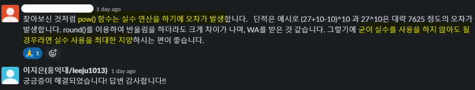 그러다가 pow()가 오차를 발생시킨다는 것을 알게되었다.